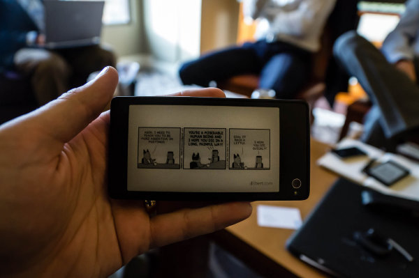 YotaPhone 最吸引眼球的是背面有一块 E-Ink 显示屏——切断电源也可以保留内容的那种。通过手机按键可以直接将画面传送到 E-Ink 显示屏上,对于看爱漫画、小说的用户来说,这个功能是比较诱人的。