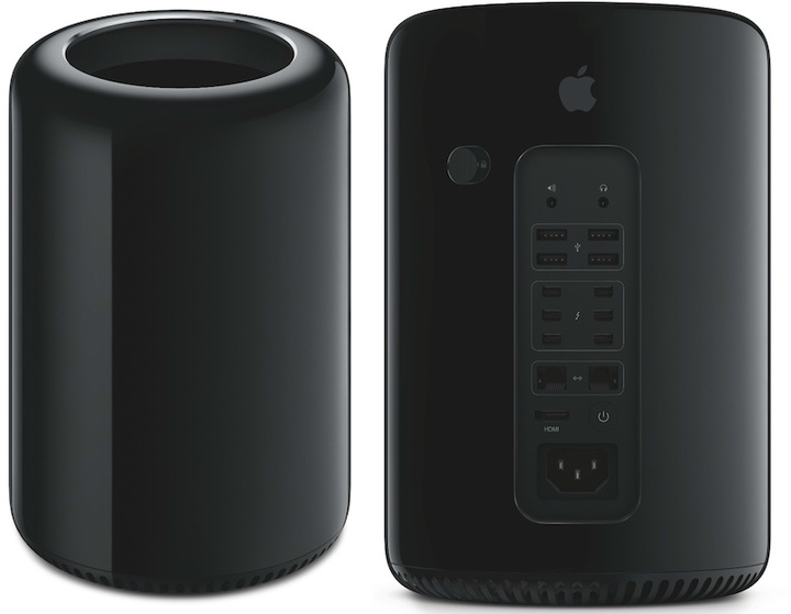 黑色的 New Mac Pro 于今年 6 月的苹果开发者大会上推出,圆筒形外观是最为颠覆性的设计,配备 Intel Xeon E5 处理器,双 AMD FirePro D500 图形处理器,是第一台搭载双 GPU 的 Mac 产品。苹果公司在 10月 宣布,New Mac Pro 最低售价为 2999 美元,将于 12 月开始上市发售。