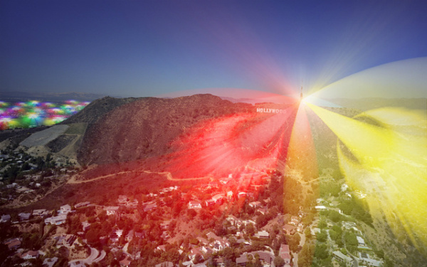 艺术家们也渲染了好莱坞山的信号辐射。远程塔向三个方向发出三种频道的辐射,分别由红、黄、蓝表示。背后则是拥有 3 个扇区的辐射的一个个基站。