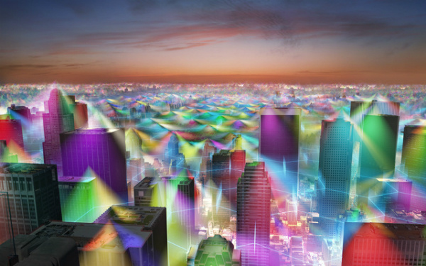 事实上,我们周围环绕着形形色色看不见的信号,如果它们变得可见,世界想必会大不相同。艺术家、可视化研究者 Nickolay Lamm 曾展示过 Wi-Fi 信号的样子,现在他想为我们描绘手机信号可视化的世界。