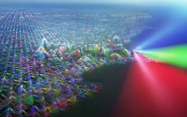 芝加哥城概念化后呈现为由蜂窝基站站点构成的、有规律的六边形网格,这些基站位于六边形的角上。每个扇区中的辐射图案代表了被分配不同频率的不同用户,这些用户的信号结合起来,在一瞬间形成一个可感知的颜色。图中的不同地区的频道组合分别都用不同的颜色表示。这些组合不是静态的,而是随着不同的用户被分配不同的频道而处在迅速变化中。如果你要拍摄这些“快速变化”,你可能看到如图中一样各种各样的色彩。你会发现,靠近市中心的区域会有更多用户,与其他地区为相比,较小体积的“六角形蜂窝”就能为相同数量的用户服务。