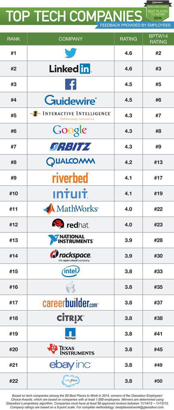 职业咨询网站 Glassdoor 最新发布了“2014 年 50 家最适宜工作公司”榜单 。Twitter 接替 Facebook 成为排名最高的科技公司,总排名仅次于首位的贝恩咨询公司。