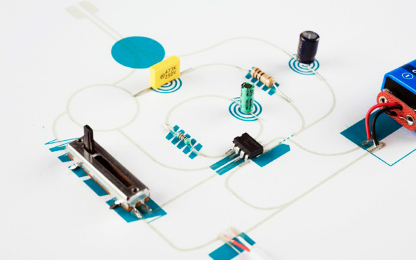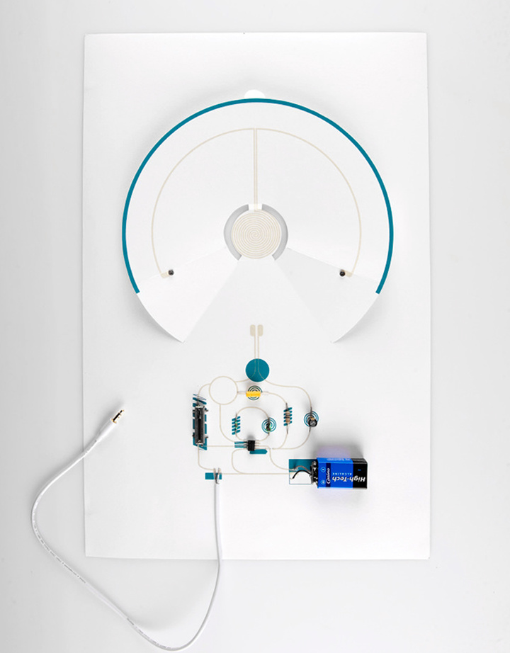 该装置使用了一系列的定制图形卡片模板,由无线电天线、扬声器、开关和 9V 电池连接器等部件组成,各个部件之间的连通由导电墨水笔和导电胶实现。