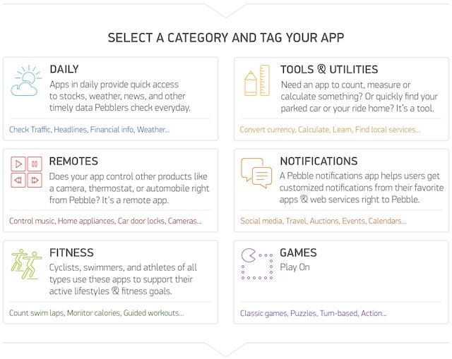 首批开放的应用类型包括生活、游戏、通知、工具以及体育和健康等七种分类。所有应用都兼容与 Pebble 连接的 iOS 和 Android 设备。如果开发者需要对应用进行功能补充,他们也可以在应用描述内加入 Google Play 和 App Store 的应用链接,引导用户前往下载。