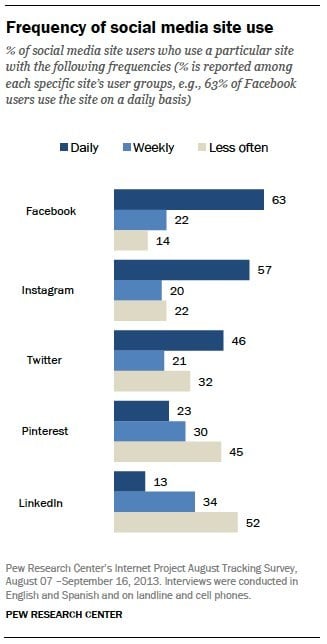 使用率方面,63% 的 Facebook 用户至少每天都会登陆网站(40% 的用户每天多次登陆),这让 Facebook 位列用户使用度和活跃度的首位。大约 46 % 的 Twitter 用户每天都会访问 Twitter,29% 会多次查看。Pinterest 和 LinkedIn 的用户往往呈现为“间歇使用模式”,只有23% Pinterest 用户和 13% LinkedIn 用户会每天使用该网站。