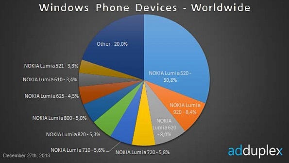 AdDuplex 的最新统计数据显示,诺基亚 Lumia 已经拿下 92.1% 的 Windows Phone 市场,继续统治同类产品。入门级 WP 设备依旧抢手,Lumia 520 构成 39.3% 的 WP8 手机市场。而 Lumia 520、521 以及 620 的市场总和为 53.8%,已经突破五成。
