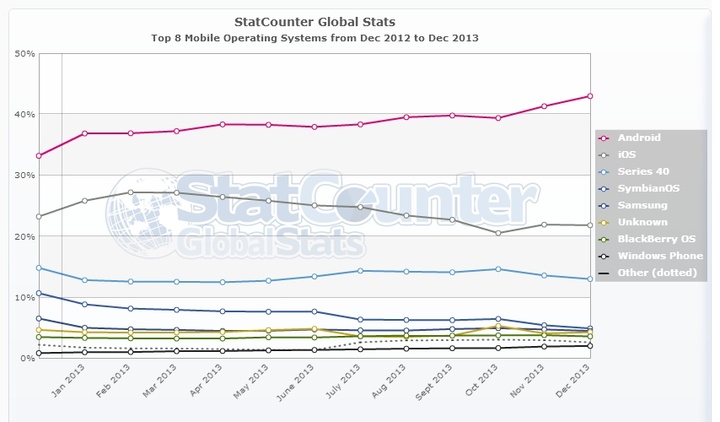 StatCounter 统计了去年 12 月全球移动设备的数据使用率情况,结果显示,Android 以 42.99% 的移动数据使用率居于首位,依旧领先于其它系统。