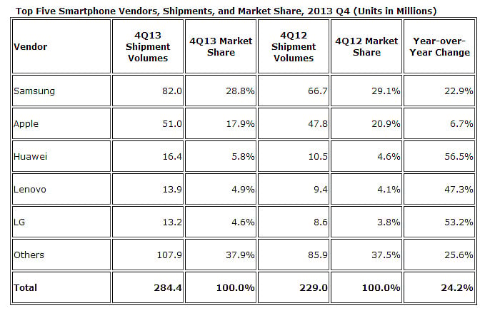 华为以 4880 万台的智能手机出货量位居全球第三,市场份额从一年前的 4% 上升至 4.9%;位于第四和第五的分别是 LG 和联想,2013 年的智能手机出货量分别是 4770 万台和 4550 万台。