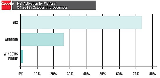 企业移动技术公司 Good Technology 发布了 2013 年第四季度企业移动设备报告,在该季度企业用户激活的移动设备中,iOS 的份额为 73%,Android 占据 26%,而 Windows Phone 的份额几乎可以忽略不计。