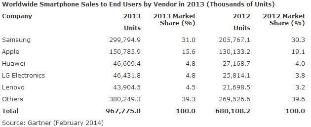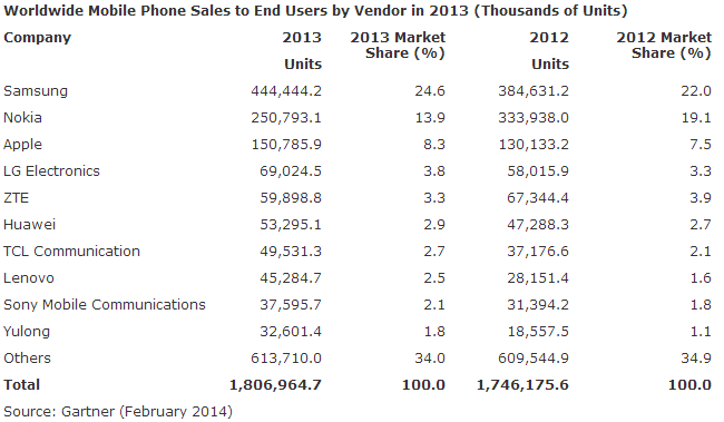 Gartner 的数据还显示,2013 年,三星以近 3 亿台的销量成为全球智能手机销量之首,苹果以 1 亿 5079 万台 iPhone 的销量位于第二,余下的分别是华为、LG 和联想。