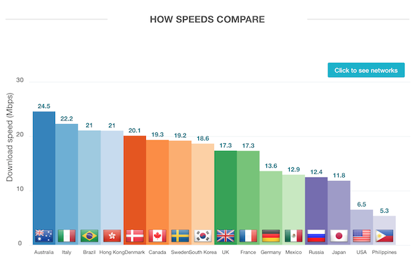 报告显示,目前澳大利亚是全球拥有最快 4G 网络的国家,平均下载速度达到 24.5 Mbps,大幅度超过美国和日本这类传统意义上的 4G 大国,这两个国家目前 4G 服务的平均下载速度仅有 6.5 Mbps 与 11.8 Mbps,在速度排行中排倒数第二与第三位置。