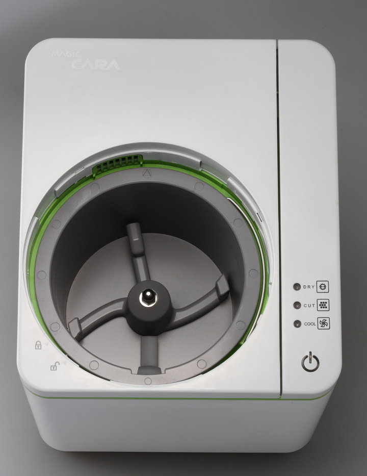机器的外形很像一台小型洗衣机:方形的机身和一个小滚筒。按照宣传片的演示,把厨余垃圾放到滚筒内,3 小时取出,你就可以得到一堆干燥、干净、粉末状的自制肥料,可以用来给家里的花花草草施肥。