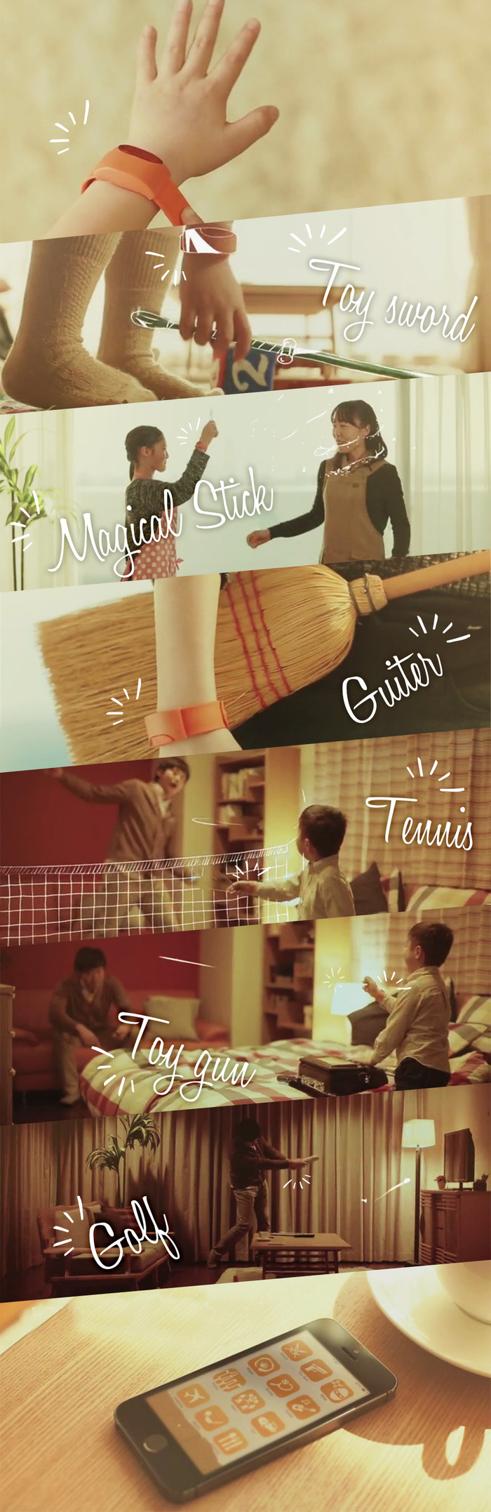 Moff 手环的思路很简单:利用小朋友的想象力,让家里的各种物件配上虚拟声效变身新玩具。比如,小朋友举起三角尺当手枪,手环感应手部动作后通过蓝牙向 app 发送指令,手机便发出枪击的声音;拿起扫把当做吉他,手机产生吉他的声效……这种全新的游戏体验不仅给家长省下了一笔玩具开销,而且还锻炼了孩子的想象力和肢体。