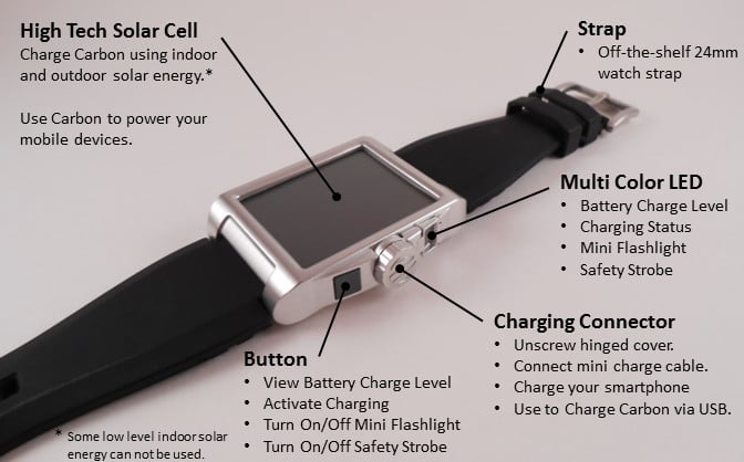 Carbon 在方形的表盘下安装了一块单晶硅太阳能电池板,使用时需要把表盘取下,将手表和待充电设备用 USB 线连接。Carbon 内部有一个 800 毫安时的电池,使用输入设备充电需要 30 分钟,用太阳能充电需要 6 小时。这块电池的可以输出 1 安培 、5 伏特、5 瓦特的电能。Carbon将太阳能转化为电能储存在电池里,再供给移动设备。