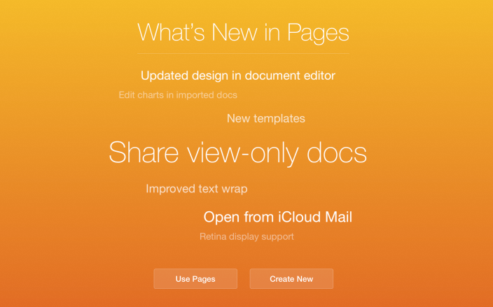 更新之后,iWork for iCloud 网页版中的 Pages,Numbers 和 Keynote 都支持了 Retina 屏幕显示,编辑界面也有所变化。同样得到优化的还有 iCloud 分享功能,现在的 iWork 只能够分享只读文件,文件也可以直接在 iCloud 邮件中打开。此前在 iCloud 上分享的文件可以被任何人编辑。