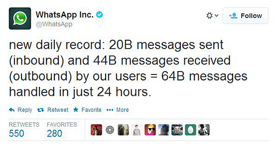 WhatsApp 在 Twitter 上宣布,他们在今天创造了一项新纪录——单日处理 640 亿条信息。