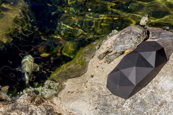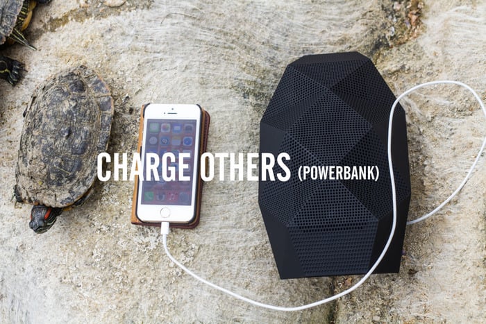 和它的名字一样,Big Turtle Shell 拥有一个和乌龟壳一样的外形,表面棱角分明。用蓝牙 4.0 连接后,Big Turtle Shell 能够播放你移动设备上的音乐,它还内置了 7800 毫安的锂电池,一次充电后能在户外续航 16 小时。这么大的电池还能当做移动电源,官方称用它能够为你的 iPhone 充电 4 次,三星 Galaxy 3 次,GoPro 6 次。