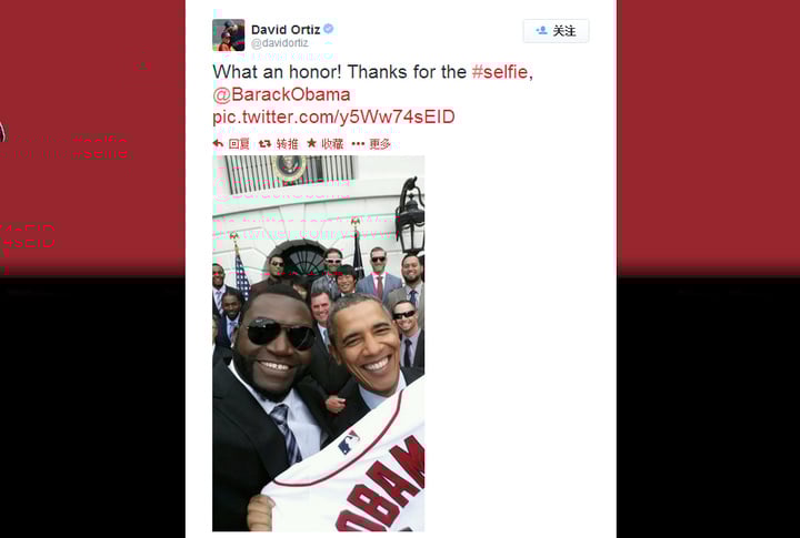 日前白宫邀请 2013 美国职业棒球大联盟冠军球队参观,球员 David Ortiz 用三星手机和奥巴马自拍一张并放在了 Twitter 上,随后三星用这张照片发推,并在回复中说“这张照片是用 Galaxy Note 3 拍的”。