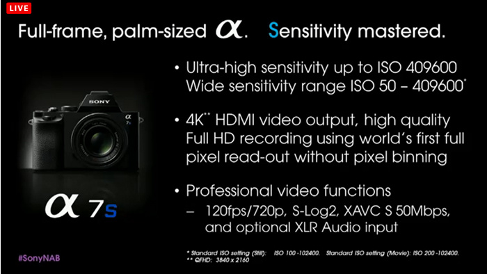 4K 时代正在向我们招手,不仅显示器制造商在追逐 4K 脚步,相机厂商也正在尝试 4K 级别的拍摄设备。日前索尼在 NAB 展会上发布了新款全画幅微单 A7s,主打 4K 视频拍摄。