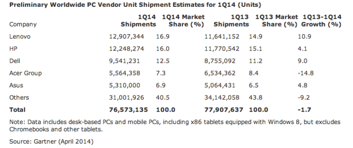 美国市场研究公司 Gartner 在 9 日发布了一份报告,结果显示 2014 年第一季度全球 PC 出货量相比去年同期下跌 1.7%。不过这次的降幅相比之前七个季度已有所缓解。