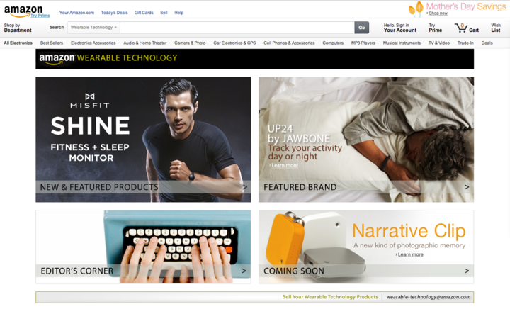可穿戴设备在各个领域激起的火花让人惊喜,终端销售商也不忘跟进这个势头正猛的聚宝盆。日前,亚马逊官网开辟了“可穿戴设备专区”。在这个专区页面里能够找到健康追踪设备、可穿戴相机、智能手表等,品牌囊括三星、Jawbone、GoPro 等。