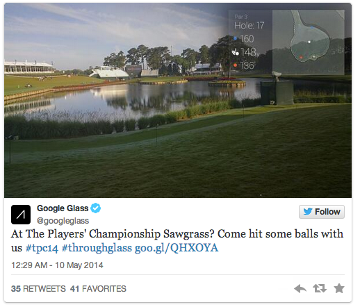 Google Glass 的官方 Twitter 账号也发布了一张照片,照片中是 Google Glass 在高尔夫球场的使用界面。