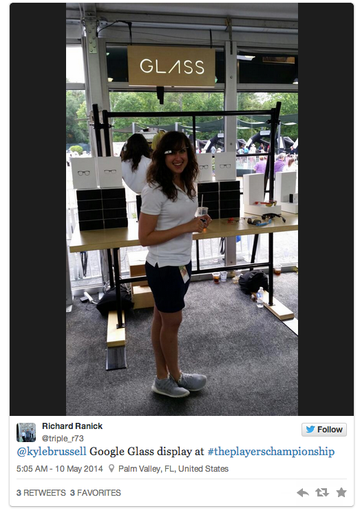 在佛罗里达州蓬特韦德拉海滩举办的“球员锦标赛”是一项高尔夫巡回赛事,今年的比赛上,一位名叫 Richard Ranick 的 Twitter 用户发现了一个 Google Glass 的销售摊位,并拍照发了 Twitter。照片中可以看到 Google Glass、包装盒,以及展示眼镜的模特。这个摊位上的 Google Glass 还附赠一个迷你摄像头。根据 Richard Ranick 的 Twitter 文字,摊位的销售人员告诉他,这是 Google Glass 第一次公开销售,并且销售量好于预期。