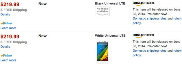 在亚马逊的官网上,搜索 Moto G,会出现两个“通用 LTE(universal LTE)”Moto G,分别为黑色和白色版本,其中黑色版的图片显示缺失。具体的容量信息也没有提供。两款 LTE 版 Moto G 售价均为 219.9 美元,相比 16 G GSM 版本的 199.9 美元略高,不过低于此前预期的 260 美元。目前亚马逊提供预售,发货日期为 6 月 30 日。