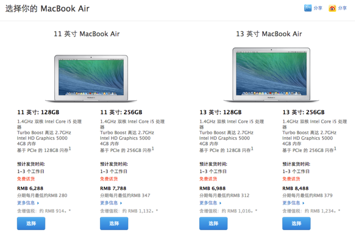 根据官网信息,11 英寸 MacBook Air 128GB 版售价 6288元,256GB 版 7788元。13 英寸 128GB 版售价 6988元,256GB 版 8488元。这一价格相比上一代产品下调幅度不小,最高达 1000 元。美国官网的起始售价分别是:11 寸 899 美元(约合人民币 5600 元);13 寸 999 美元(约合人民币 6200 元)。