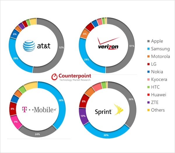 不过今年对大部分手机厂商来说前景依然严峻,例如当中苹果与三星就占据了三分之二的美国手机市场份额,前者更成为四大运营商其中三家的销量冠军,像 AT&T 和 Verizon,iPhone 都占据了这两家超过 50% 的出货量。