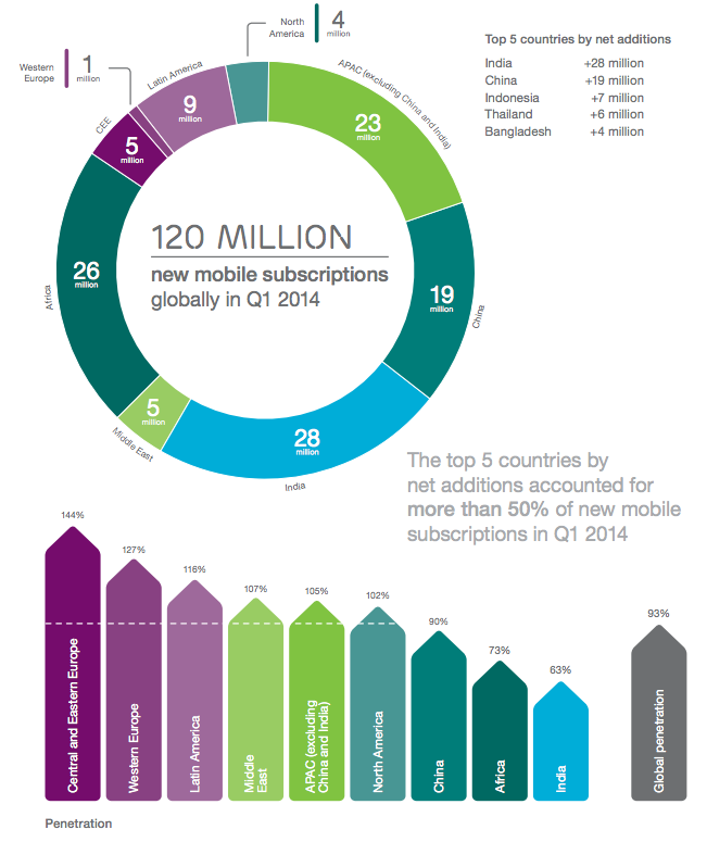 爱立信的这份报告指出,截止到今年三月,全球手机保有量为 68 亿部,这也意味着全球平均手机渗透率达到了 93%。报告预测,到今年底,全球手机保有量将达到 70 亿,而明年将要超过全球 72 亿人口这个数字,平均渗透率将超过 100%。