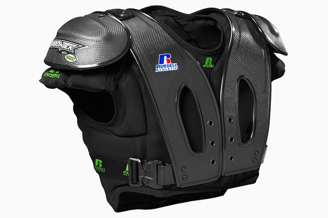 有没有发现,近几年越来越多的产品在描述材料成分时都会加个碳纤维来提高逼格。飞机、汽车、自行车、衣服……貌似一采用碳纤维,就有了种“无坚不摧”的感觉。除了战场,需要“无坚不摧”的地方还有“运动场”。所以,著名运动品牌 Russell Athletic 推出了碳纤维制造的护肩(CarbonTek pads ),号称穿上它连参加美国职业橄榄球联盟(NFL)都不怕了。
