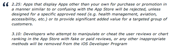 根据 TechCrunch 的知情人爆料,苹果自上周开始拒绝开发者提交类似的应用。一位开发者就遭到了拒绝:他所开发的游戏已经经过了数次认证,可就在最近的一次更新中(据称仅仅修改了皮肤,并没有修改底层代码),App Store 拒绝了这款游戏,并给出了《App Store审核指南》的 2.25 和 3.10 条款。