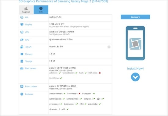 近日,GFXBench 曝光了新一代三星 GALAXY Mega 的参数, 距去年 4 月三星 GALAXY Mega 发布一年多之后,GALAXY Mega 2 “呼之欲出”。