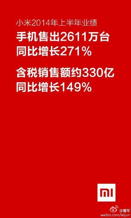 今天上午,雷军在微博上公布了小米上半年的业绩。在过去的 6 个月,小米共计销售了 2611 万台手机,同比增长 271%;含税销售额约 330 亿,同比增长 149%。