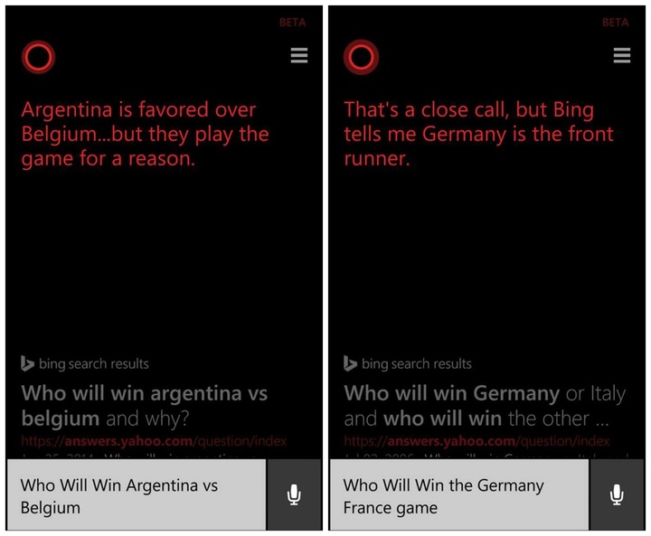 上周末,微软为 Cortana 增加了世界杯预测的功能,在随后进行的四场八分之一决赛中,Cortana 成功预测了全部比赛结果,当然包括美国战败比利时那场。Cortana 通过分析各支球队过去的比赛结果、比赛时间判断他们的实力,再根据天气状况、主场优势、球场草地特点等综合因素,加上博彩市场公开数据、民意调查、社交媒体等网络上出现的各种数据来分析来判断每场比赛的结果。