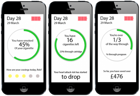 从外形上看,Relieve 与普通电子烟别无二致,同样通过雾化器将烟液加热为雾气,但其独特之处是与手机上的自定义应用程序互相协作,可依据戒烟计划将电子烟中的尼古丁含量逐步减少。