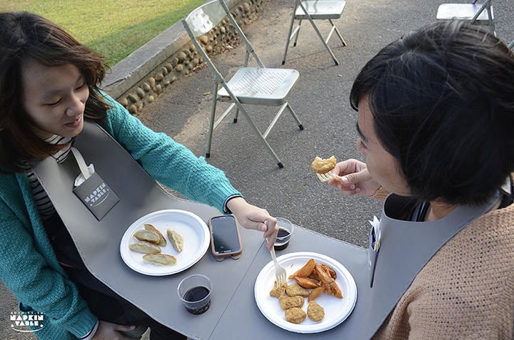 “低头病”似乎并没有根治良方,不过不少人已经尝试了各种新奇手法。台湾的一个大学生就搞出了一个餐桌 Napkin Table,“强迫”人们在吃饭时面对彼此,从而“扔掉”手机。