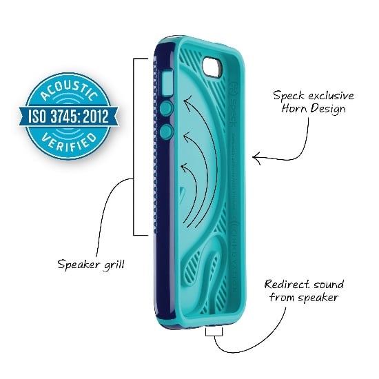 CandyShell Amped 手机壳内部被设计成了喇叭状的波导,可以改变声音从扬声器里出来的路线,将声音从低端引导至手机顶部,从而提高音量。不用外接电线,也不用蓝牙连接,电池、扬声器之类的设备也不需要,手机的音量就能增加一倍。