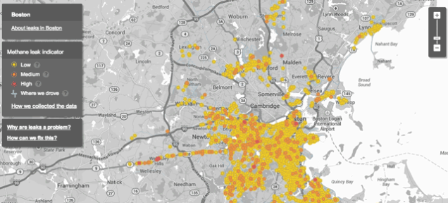 街景汽车所测量到的数据将会加入到 Google 地图中去,如图中我们看见的橙黄色圆点就是煤气泄漏的地方,波士顿的圆点非常密集,煤气泄漏问题严重。为了解决煤气泄漏的安全隐患,美国政府承诺会对老旧管道设备进行更新换代。