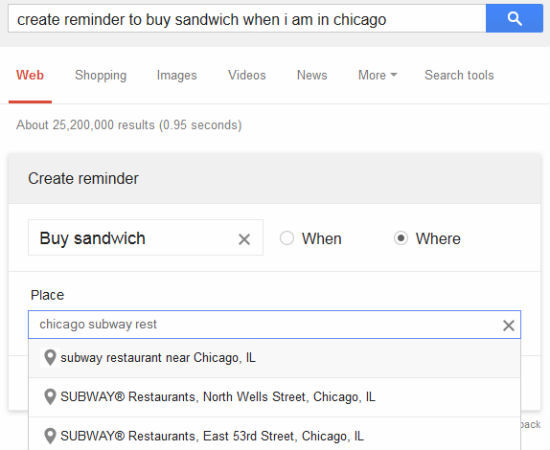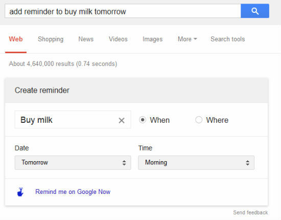 就是这么方便,首先打开 Google,在搜索栏输入含有“add reminder”或者“create reminder”的句子,再进行地点、时间、事件的编辑。最后按下“Remind me on Google Now”。