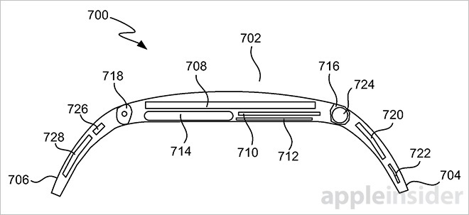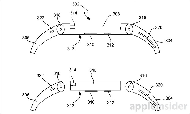 该专利表明此次腕戴式设备将包含加速计、陀螺仪、GPS、NFC 天线、蓝牙和先进的传感器,并且屏幕与表带可拆分,可连接移动电子设备,可独立使用,可识别手势操控。