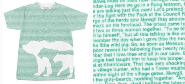 可以试试 Litographs 系列的 T 恤或帆布包。从远处看,Litographs 的 T 恤和帆布包上印有各种奇特的图案。仔细观察你会发现,这些图案是由大量的文字组成。Litographs 的制作方式是,先将书中的文字无限缩小,随后将文字组合成各种图案打印出来,最终制作成衣服或者帆布包。每张打印出的图案可以涵盖 4 万字。