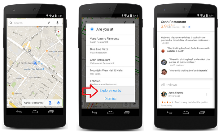 一旦你到达一个目的地,“探索”便会告诉你更多关于此地的延展信息。如果你使用的是 Android 系统,只要简单地点击屏幕右下角“我的位置”按钮或地图上的蓝点,你就可以阅读你打算光临的餐馆评价,以及餐馆附近最新的交通信息。