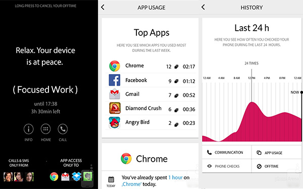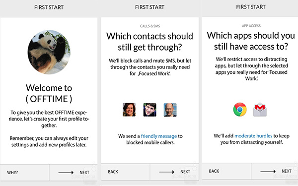 这款 app 有一个干净的界面,在开启之后,app 将通过一个向导手续来指导你定制你的个人需求。你可以选择哪些联系人的来电或短信能够到达你的手机,以及哪些 app 能够连接到你的手机。只需拖动一个蓝色处理图标然后设定好离线时间,你就能好好享受个人空间而不再被平日爆炸式的信息所打扰。Offtime 在工作时,界面只会出现 app 快捷键抽屉,调用应用程序以及智能手机使用信息,从另一方面帮你改掉一进入手机界面就应用开不停的习惯。