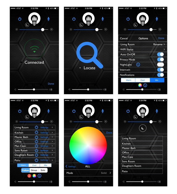 LightFreq 的应用中有一个“follow me”功能,能够在你进入一个房间时打开设备,在离开时关掉设备。此外,LightFreq 有内置的麦克风,可以让你在家里直接实现通话,你甚至可以运用 LightFreq 设置来电提示:当有电话打进,家里的灯泡可以通过改变颜色或者闪烁来提示你。