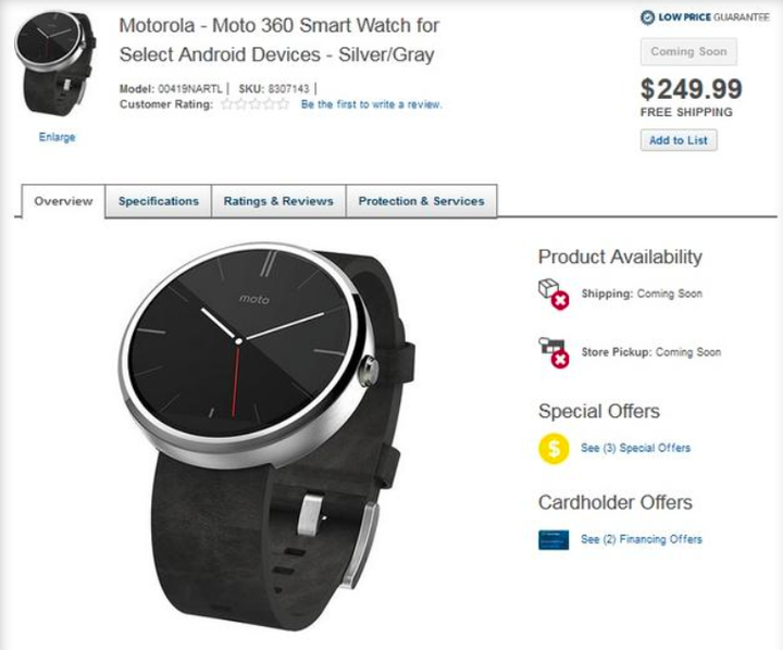 没来得及等到“夏天上市”的期限,Moto 360 就首先现身在美国百思买(Best Buy)的网站上。当中列出了一系列 Moto 360 的数据参数,售价为 249.99 美元。