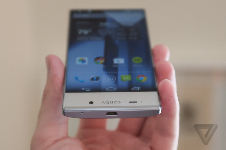 这次发布会的主题是“take the edge off”,而这款“拿掉边框”的 Aquos Crystal,配备了 5 英寸的无边框高清显示屏。它的画面一直延伸到设备的顶部,以至于完全找不到听筒。而夏普解释说其采用了直达波传感器的技术,通话时将通过震动来传递声音。而前置摄像头也被移到了手机的底部,因此自拍的朋友可能得重新琢磨姿势和角度了。