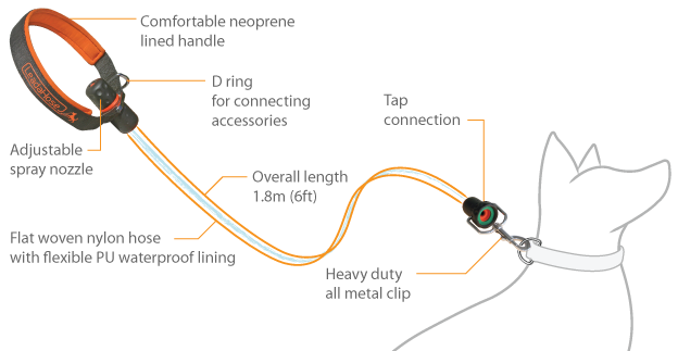 这款产品主要是为了“处女座”主人和“非处女座”狗狗而设计。夏日炎炎,出去遛狗时,只要稍微不留意,精力充沛的汪星人就会忍不住跳进水坑或各种烂泥地里玩耍。而这时你只需要拿出你的 LeadaHose,接上附近的水龙头,便可以即时给狗狗洗澡兼降温了。