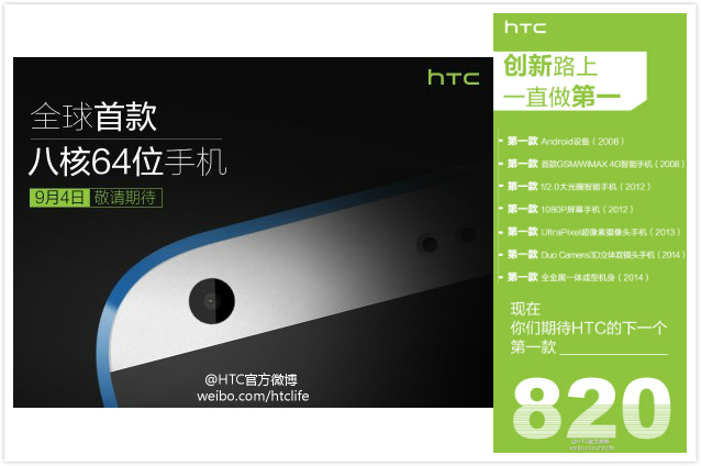 HTC 之前的一条微博中列举了多项“第一”记录:首款 Android 设备、1080p 屏幕、全金属一体成型机身等,在最后提出了HTC 下一个第一款是什么,为 Desire 820 留下了悬念。HTC 昨天发布的微博内容:#全球首款 8 核 64 位手机#是的,这次还是第一。应该就是对 Desire 820 的呼应。
